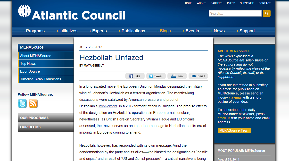 In a long-awaited move, the European Union on Monday designated the military wing of Lebanon’s Hezbollah as a terrorist organization. The months-long discussions were catalyzed by American pressure and proof of Hezbollah’s involvement  in a 2012 terrorist attack in Bulgaria. The precise effects of the designation on Hezbollah’s operations in Europe remain unclear; nevertheless, as British Foreign Secretary William Hague and EU officials assessed, the move serves as an important message to Hezbollah that its era of impunity in Europe is coming to an end.
